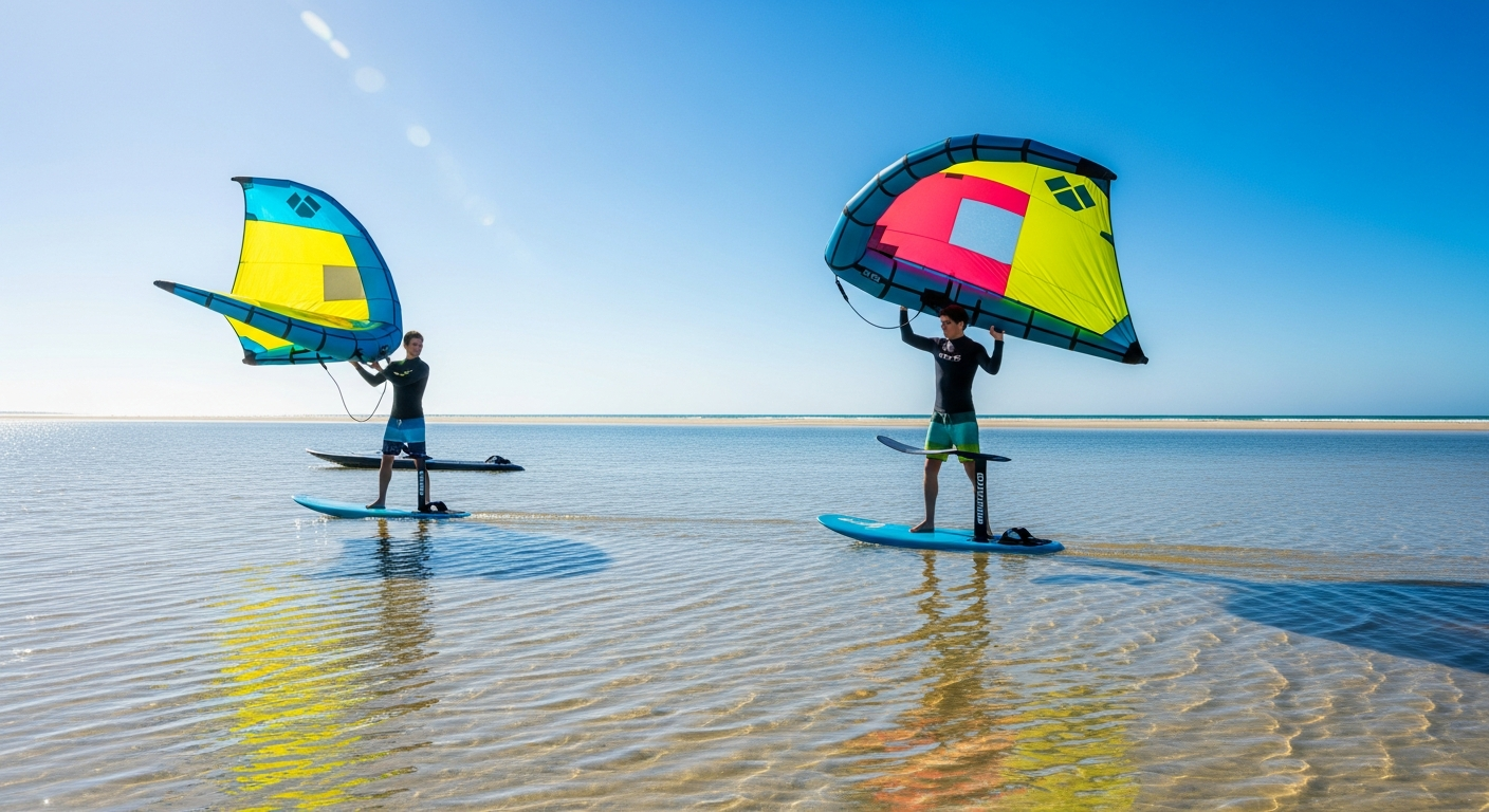 - Une aile gonflable (wing) tenue à la main via des poignées rigides. Elle capte le vent et vous propulse : sans être attachée à vous. Si vous lâchez, l'aile tombe et ne vous entraîne pas. C'est ce qui rend la discipline intrinsèquement sûre.