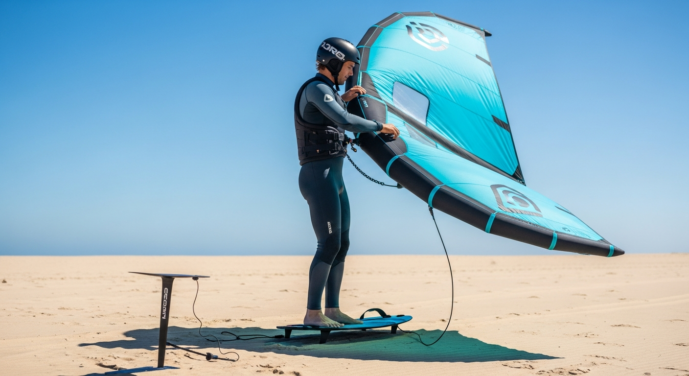 En apprentissage, pratiquez la manipulation de l'aile sur la plage avant d'aller à l'eau. Apprenez à réduire la puissance en orientant l'aile différemment par rapport au vent. Consultez notre guide pour débuter le wing foil en douceur.