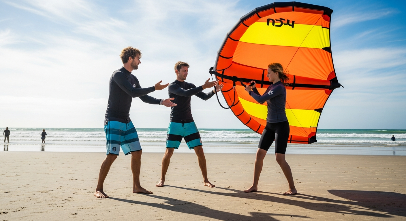 Tout commence sur la plage. Votre moniteur vous apprend à tenir l'aile, à sentir la fenêtre de vent, à passer d'une main à l'autre et à comprendre les zones de puissance et de neutre. Vous apprenez aussi à plier et gonfler l'aile correctement. Durée : 1 à 2 heures. C'est la base de tout le reste : ne la négligez pas.
